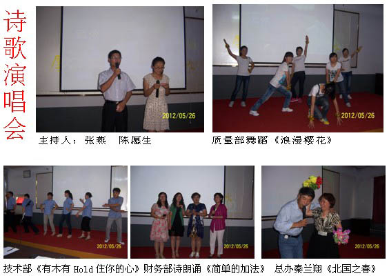 5月26日下午“纪念‘二次创业七周年’‘文化展示’与诗歌演唱会”在公司三楼会议厅举行。本次活动由公司总经理程玉水精心策划,副总经理孙利英及陈愿生、张 燕(小)担当主持。